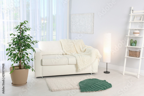 apartment, arrangement, background, comfort, contemporary, cosy, decor, decoration, design, detail, element, estate, fashion, ficus, flat, floor, furniture, home, house, houseplant, indoor, interior, lamp, lifestyle, light, living, modern, picture, plaid, plant, pot, relax, rest, room, rug, shelf, to sit, sofa, soft, style, stylish, trend, trendy, wall, white, window