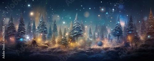 Stylish magical forest with Christmas trees and glowing bokeh lights Generative AI