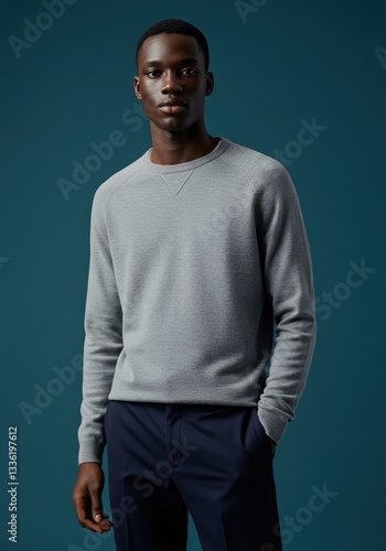 man, blue background, portrait, male model, confident, stylish, casual clothes, fashion, standing, trendy, studio shot, male, photogenic, youthful, elegant, dark skin, posing, fashion model, clothing, natural light, clothes rack, simplicity, casual attire