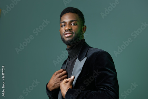 Stylish man in sleek black attire confidently poses against a vibrant green wall background