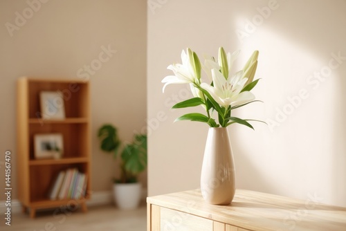 stylish, modern, vase, fresh, lily, simple, wooden, sideboard, serene, airy, living, room, highlight, minimalist, aesthetic, natural, lighting, casting, gentle, shadow, surrounding, beige, wall, emphasize, functionality, organised, bookshelf, seating, capture, tranquil, ambience, uncluttered, element, maintaining, ample, copy, space
