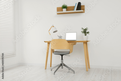 Stylish office interior with comfortable chair, desk, laptop and lamp