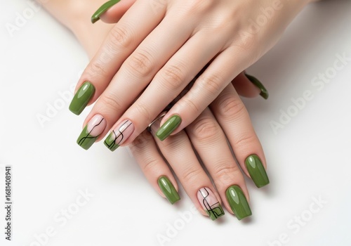 Stylish Olive Green Manicure with Black Line Art on Negative Space