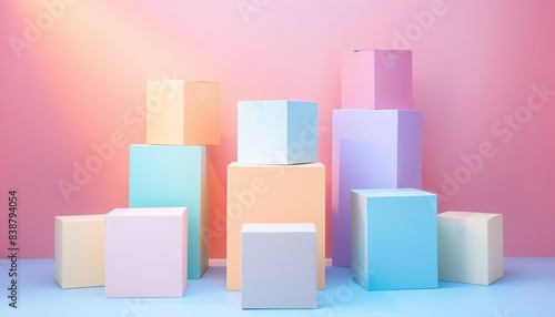 Stylish pedestal design, soft pastel background, brightly lit, white box variety, symmetrical elements, chic packaging