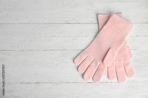 Stylish pink gloves on white wooden background, top view with space for text. Autumn clothes