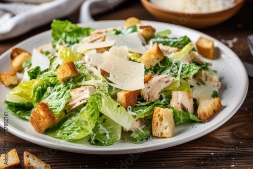 stylish plate of chicken caesar salad with croutons, parmesan cheese, and homemade dressing, created with generative ai