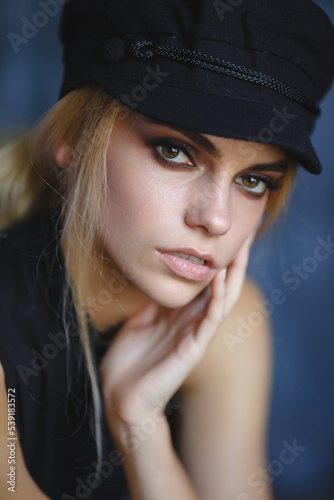 Stylish portrait of a young attractive girl with a European appearance. A girl with big eyes in a black fashion hat. A large portrait