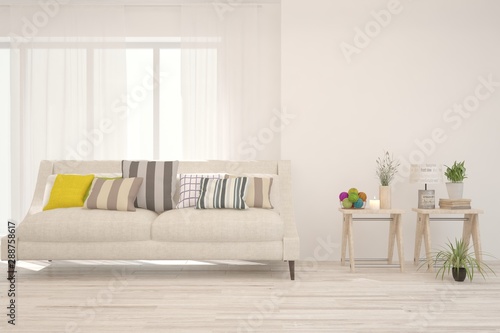 Stylish room in white color with sofa. Scandinavian interior design. 3D illustration