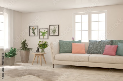 Stylish room in white color with sofa. Scandinavian interior design. 3D illustration