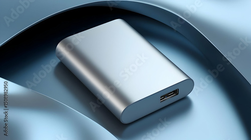 silver, aluminium, technology, electronic, device, usb, charging, modern, minimalist, design, product, display, studio, light, blue, fabric, smooth, texture, contraption, portable, battery, power, charger, grey, metallic, simple, sleek, tech, digital, image, rendering, soft light, abstract