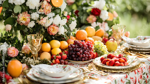 spring, picnic, setup, fruit, strawberry, grape, orange, trendy, table, floral, pattern, tablecloth, chic, crockery, gold, cutlery, natural, light, blooming, flower, greenery, lifestyle, vibrant, seasonal, leisure, style, springtime, fresh, food, arrangement, stylish, setting, decorative, design, detail, colourful, garden, foliage, luxurious, atmosphere