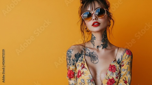 Stylish tattooed woman in sunglasses and floral dress posing against yellow wall.