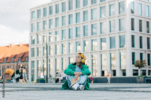 Stylish teenage student girl with headphones sits on city street of Wroclaw, Poland