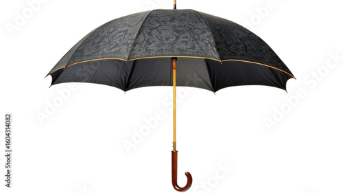 Stylish umbrella with intricate design and wooden handle suitable for rainy days in urban settings on transparent background