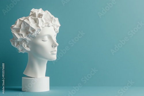 Stylish white sculpture with ruffled hair detail against a soft teal background, perfect for modern decor.
