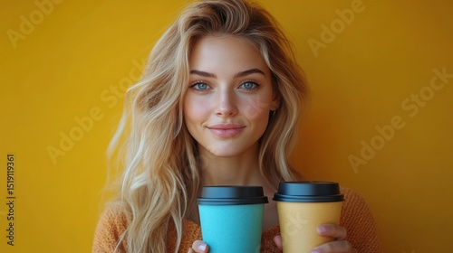 Stylish woman holding colorful takeaway coffee cups in front of a vibrant yellow background while smiling warmly