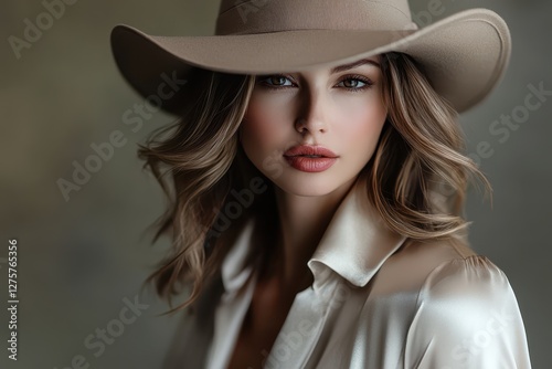 woman, female, portrait, model, fashion, style, hat, fedora, blouse, clothing, apparel, beauty, pretty, attractive, elegant, sophisticated, glamour, sensual, mysterious, confident, expressive, eye, hair, wavy hair, make-up, skincare, studio shot, indoor, closeup