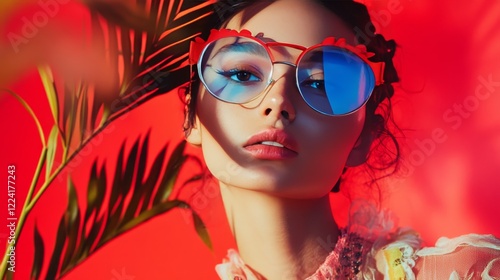 woman, sunglasses, fashion, portrait, beauty, model, vibrant, tropical, summer, red, trendy, make-up, accessory, coiffure, nature, palm, closeup, colourful, relaxation, feminine, elegance, artistic, photo, scene, leisure, lifestyle, personality, bright, skin, chic, expression, mood, charme, bold, serenity, stylish, warm, sunlight, glamour, young adult, high-coloured, playful, freshness, ethnic, creative