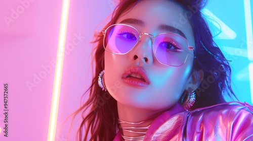 Stylish woman in neon lights, wearing sunglasses and jewelry, expressing a modern and trendy fashion vibe.