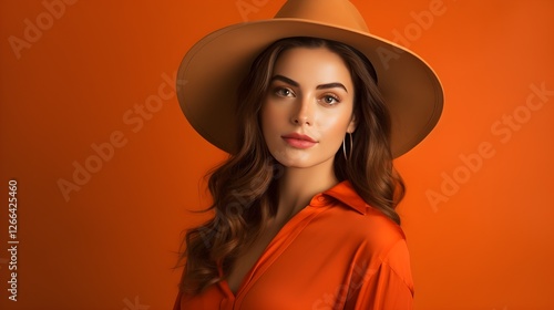Stylish Woman in Orange Shirt and Brown Hat Posing Against Vibrant Background