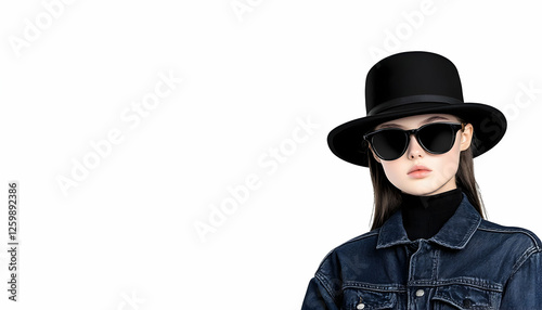 woman, sunglasses, hat, stylish, fashion, portrait, female, beauty, model, elegance, trendy, style, glamour, beautiful, person, adult, young, face, attractive, confident, posing, clothing, accessory, modern, chic, casual attire, fashionable, denim, jacket, looking, girl, background, studio, headwear, dark, contemporary, hipster, vogue, white, youth, indoor