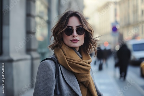 Stylish woman in sunglasses and scarf walking on a city street.