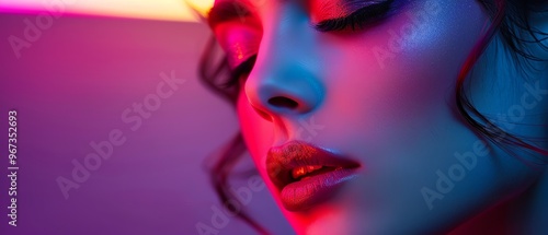 Stylish woman, purple backdrop, colorful hair and makeup, dramatic closeup, vibrant lighting