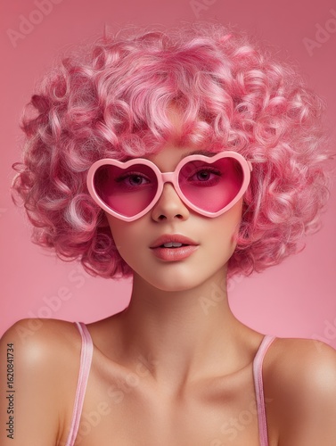 Stylish woman wearing a pink wig and heart-shaped sunglasses on pink background. The woman exudes confidence and playfulness.