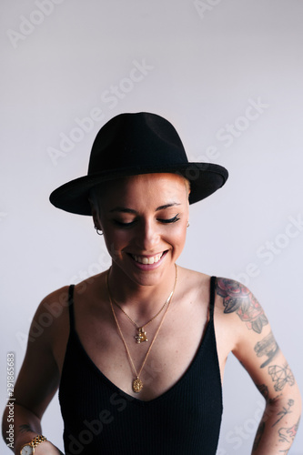 elegant, confident, teeth, stylish, style, studio, smile, simple, minimal, hat, happy, fashion, contemporary, confidence, clothing, clean, apparel, aesthetic, accessory, copy space, copy space, young, vogue, caucasian, white, woman, girl, female, person, people, adult, adult, 20s, grown-up