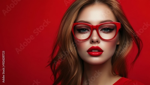 Stylish Woman with Red Glasses Posing Against a Red Background