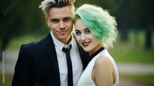 Stylish young couple posing outdoors, with the man in a sleek black suit and the woman with vibrant green hair and a chic dress, exuding confidence and modern elegance