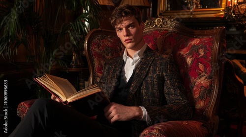 dark, academe, stylish, young, man, fitted, blazer, trousers, vintage, open, book, fashionable, eclectic, decor, fashion, shoot, classic, style, sophisticated, refined, intellectual, trendy, bookish, cosy, atmosphere, leisure, reading, elegant, hipster, hot drink, shop, lifestyle, ambience, student, retro, aesthetic