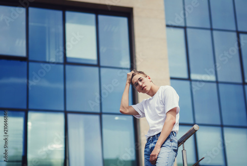 fashion, style, street, hipster, model, hair, spring, side, jean, goggles, urban, adult, attractive, casual attire, caucasian, city, cool, enjoy, fit, lifestyle, looking, macho, man, modern, outside, park, people, person, portrait, serious, student, stylish, summer, sunny, tough, trendy, white, copy, space, blue, building
