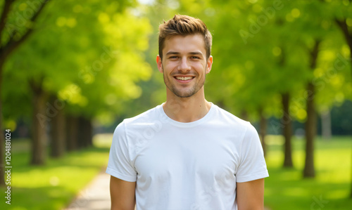 Stylish young man in white t-shirt: Handsome young man with stylishly styled hair, effortlessly cool in a simple yet stylish white t-shirt and jeans. Green nature background in the park.