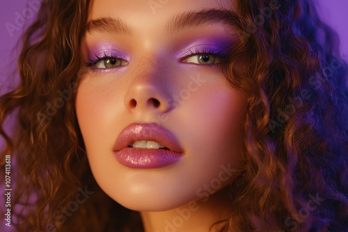 Stylish young woman with wavy curls and purple makeup posed in a studio