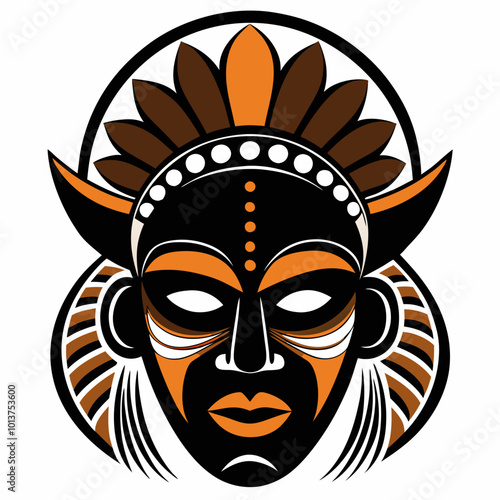Stylized African mask with bold tribal patterns in a striking black and orange illustration