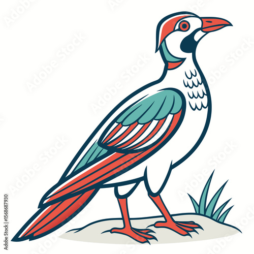bird, stylised, illustration, coral, teal, white, graphic, animal, nature, wing, feather, beak, eye, leg, claw, grass, ground, standing, profile, clean, simple, modern, art, design