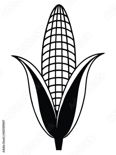 corn, maize, cob, grain, food, agriculture, harvest, organic, natural, healthy, vegetarian, vegan, ingredient, cooking, farm, field, crop, plant, stalk, kernel, sweet corn, black-and-white, monochrome, graphic, icon, symbol, illustration, simple, minimalist, stylised, isolated, cut-out, design element