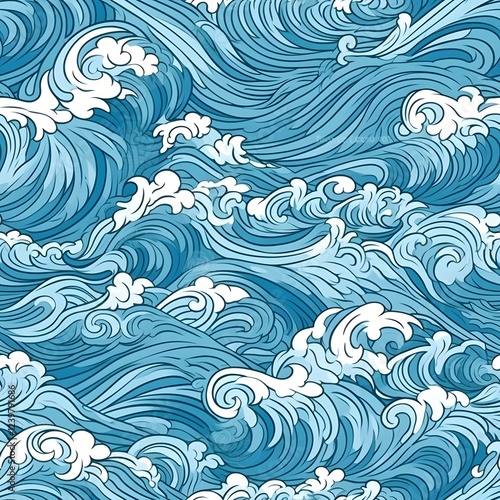 wave, seamless, pattern, blue, water, ocean, sea, crest, white, curving, line, texture, flowing, intricate, design, repeating, background, watercolor, graphic, illustration, art, abstract, style, japanese, asian, traditional, decorative, element, fabric, print, wallpaper, artwork, image, digital, seamless pattern