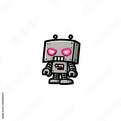 Stylized cartoon robot with square head, glowing pink eyes, and metallic body on white