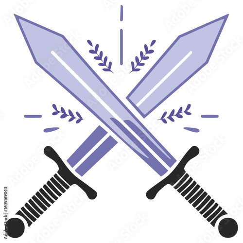 sword, sword, crossed, cross, blade, blade, hilt, weapon, weapon, mediaeval, knight, warrior, battle, fight, combat, conflict, duel, power, strength, victory, triumph, courage, honour, emblem, icon, symbol, crest, logotype, illustration, graphic, vector, design, stylised, flat, minimalist, decorative, laurel, laurel, chaplet, achievement, ancient, history, fantasy, gaming, challenge, competition, success