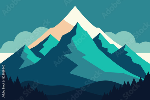 mountain, mountain, landscape, nature, peak, summit, snow, snowy, cloud, cloud, sky, blue, teal, green, orange, white, geometric, stylised, flat, design, illustration, vector, graphic, minimalist, modern, scenic, adventure, travel, background, wallpaper, abstract, art, serene, peaceful, wilderness, forest, tree, silhouette, vista