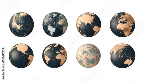 Stylized globes featuring intricate continent designs, ideal for digital applications, transparent background for versatile use