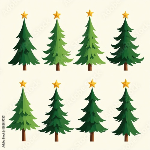 Stylized Green Christmas Trees with Golden Stars Arrayed