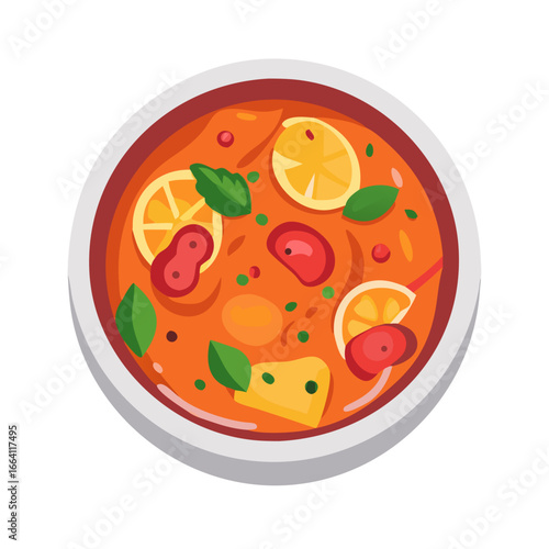 Stylized illustration of a vibrant bowl of hot tomato soup