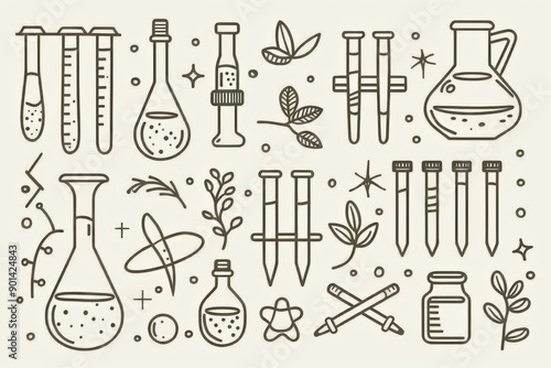 Stylized illustration of laboratory equipment, including test tubes, flasks, and natural elements, perfect for science-themed projects.