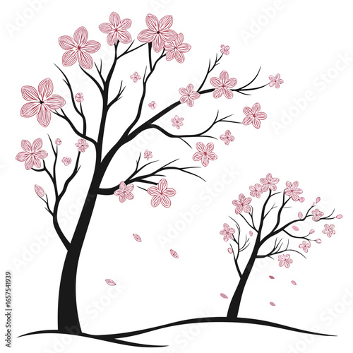 Stylized illustration of two black silhouette trees adorned with delicate pink cherry blossoms and falling petals against a white background