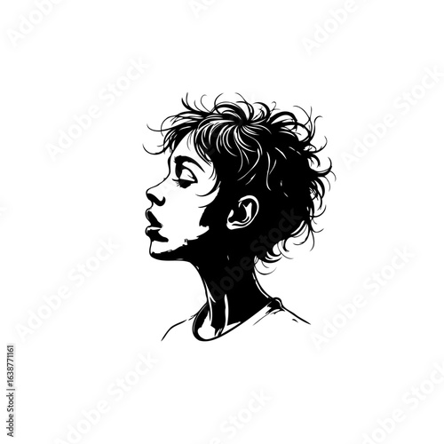woman, portrait, profile, coiffure, curly, short, black, white, face, young, female, person, drawing, illustration, vignetting, artistic, stylish, monochrome, vector, simple, minimalist, beauty, elegant, model, silhouette, graphic, design, artwork, isolated, background, looking, contemplative, pensive, thoughtful, serene, calm, peaceful, introspective, dreamy, graceful, charming, appealing, striking, evocative