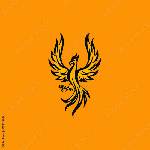 phoenix, bird, mythology, animal, creature, wing, feather, illustration, art, graphic, design, symbol, icon, vector, silhouette, black, yellow, orange, background, isolated, elegant, stylish, template, creative, decorative, ornament, rising, flying, soaring, power, strength, courage, freedom, rebirth, flames, fire, energy, dynamic, modern, abstract, shape, element, composition, digital, print, commercial, editorial