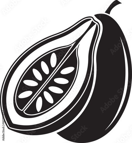papaya, fruit, tropical, food, illustration, graphic, silhouette, cut, half, cross section, seed, flesh, organic, healthy, fresh, ripe, epicure, culinary, diet, nourishment, vitamin, sweet, exotic, botanical, plant, nature, vector, icon, clip art, drawing, design, art, simple, minimalist, clean, bold, black-and-white, contrast, texture, pattern, vitamin c